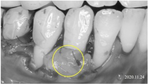 上の写真では、黄色の丸で囲っている部分が、移植した結合組織の位置になります。