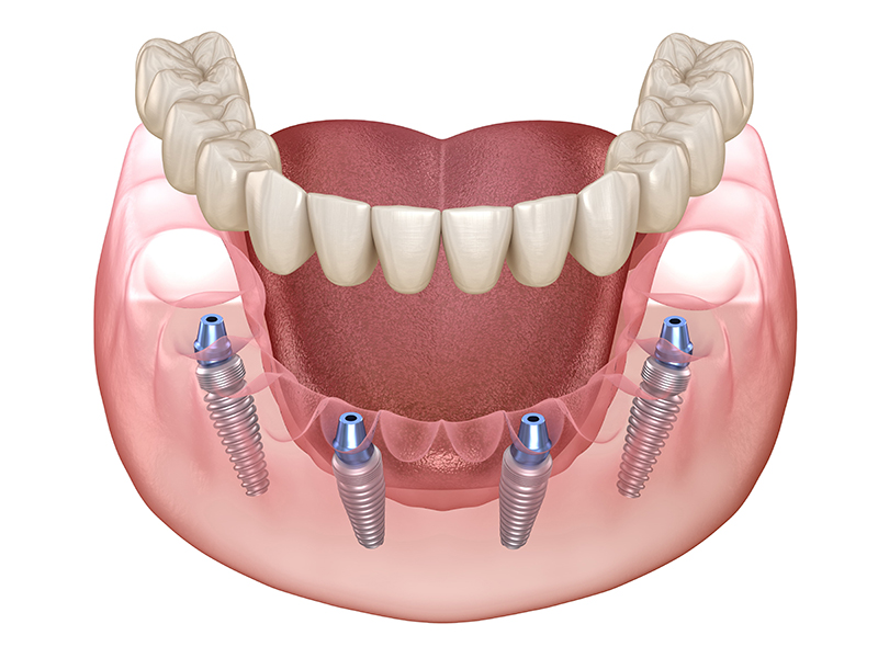 All-on-4とは、歯を全て失った、または重度に歯が損なわれた方に対し、最小4本のインプラント本数で全顎の咬み合わせを回復する治療法です。一本に対し一本のインプラントを入れる治療では、多数のインプラント埋入や骨造成などが必要となるケースも少なくありませんでした。